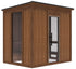 Blending classic craftsmanship with modern durability, this sauna showcases a Kodiak brushed spruce exterior, Thermory thermo-spruce interior walls, and brushed black ceiling panels. It includes a Thermory premium clear glass door with black hardware and two insulated glass panels centered along the bench walls, offering light and visibility while preserving privacy.