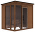 Blending classic craftsmanship with modern durability, this sauna showcases a Kodiak brushed spruce exterior, Thermory thermo-spruce interior walls, and a brushed black ceiling. It includes a Thermory premium clear glass door with black hardware and three insulated glass panels, placed on the corner wall left of the entry for a bright and open feel.