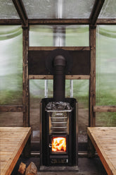 High-quality, rust-resistant aluminum and steel surround the wood stove, deflecting heat and protecting the sauna, ensuring safety and durability.