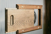 Complete door assembly with jamb, hinges, ball catch, and wood handle